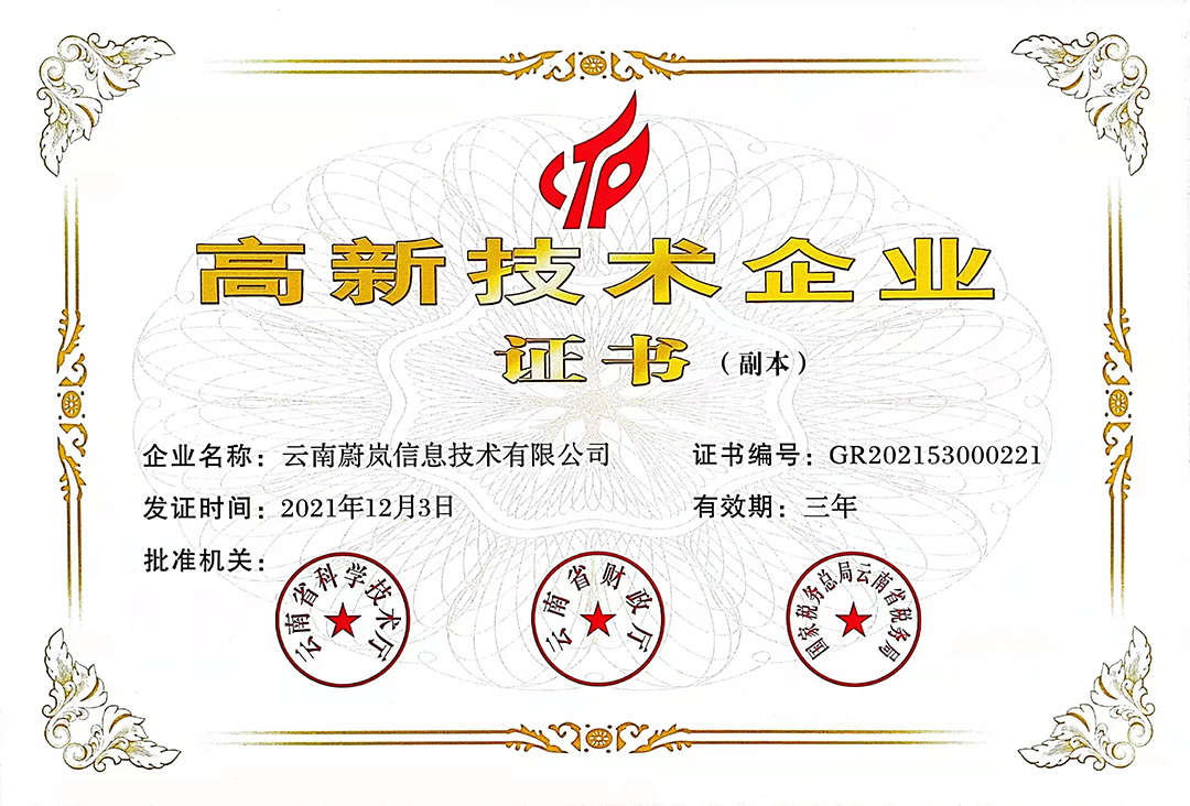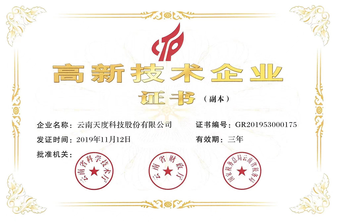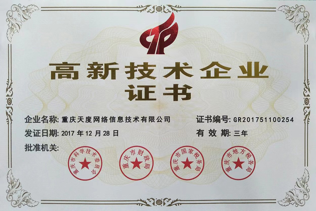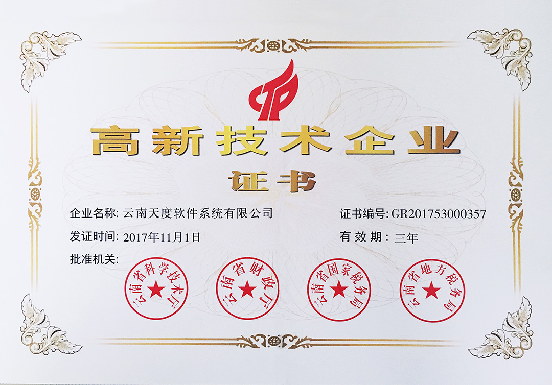 云南天度集團旗下云南蔚嵐信息技術(shù)有限公司、云南天度科技股份有限公司、云南天度軟件系統有限公司、昆明天度網(wǎng)絡(luò )信息技術(shù)有限公司、重慶天度網(wǎng)絡(luò )信息技術(shù)有限公司等5家企業(yè)獲得國家高新技術(shù)企業(yè)認定。