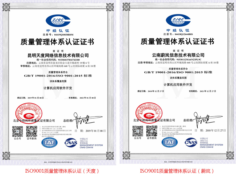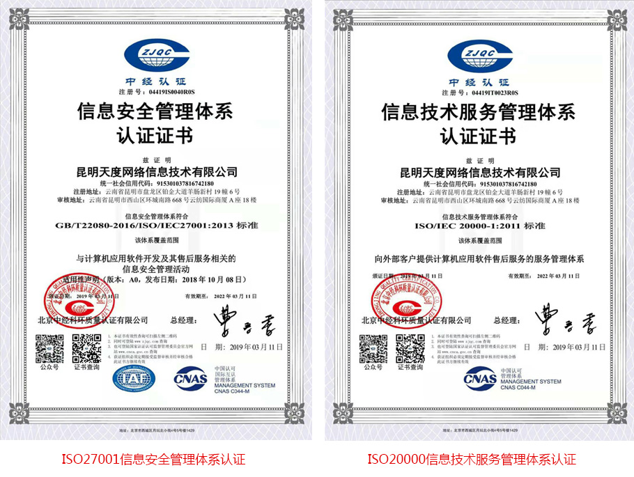 天度集團獲得ISO27001信息安全管理體系認證、 ISO20000信息技術(shù)服務(wù)管理體系認證、ISO9001質(zhì)量管理體系認證等多重體系認證,這標志著(zhù)在天度在信息安全管理、信息技術(shù)服務(wù)管理、計算機軟硬件開(kāi)發(fā)質(zhì)量管理等方面進(jìn)入國際標準化體系。