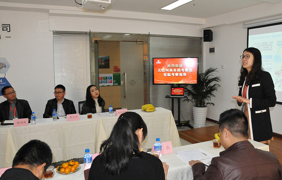 文山州商務(wù)局局長(cháng)陶艷,市場(chǎng)體系建設科、硯山縣、西疇縣、麻栗坡縣、馬關(guān)縣、丘北縣、廣南縣工信商務(wù)局等主要領(lǐng)導共13人蒞臨天度集團考察調研,天度集團董事長(cháng)鄭桂文、昆明電子商務(wù)協(xié)會(huì )秘書(shū)長(cháng)胡曉玲、天度網(wǎng)絡(luò )公司楊副總經(jīng)理、蔚嵐信息技術(shù)有限公司總經(jīng)理陳玉鳳、天度軟件公司總經(jīng)理張羽昊、天度品牌中心負責人等參加了本次調研會(huì )議。雙方就農產(chǎn)品供應鏈打造、電商培訓及宣傳、區域公共品牌培育、電商大數據中心等進(jìn)行了調研和交流。