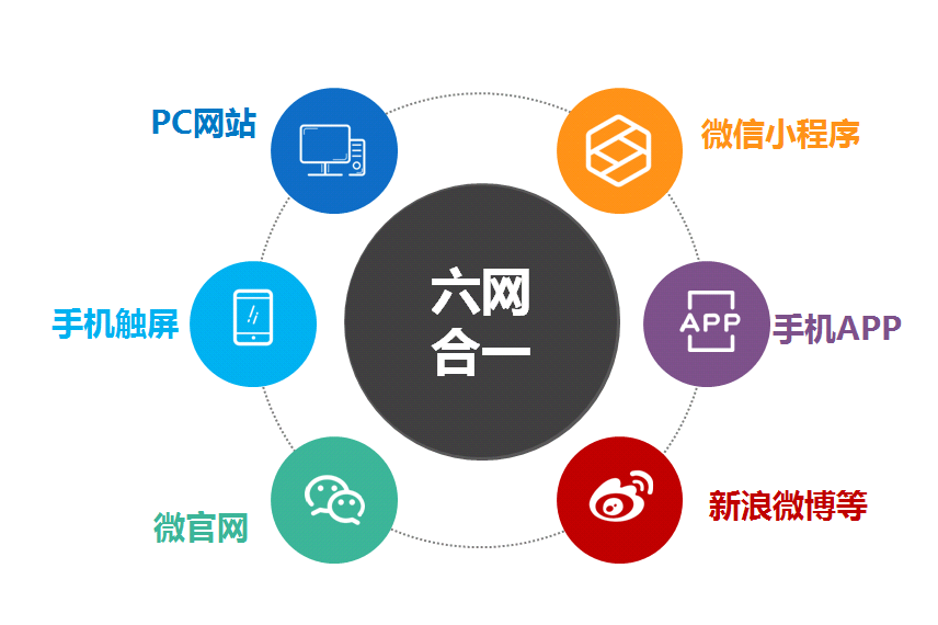入口為六網(wǎng)合一(PC版、觸屏版WAP、微信版、微博信息推送、手機APP、一個(gè)主后臺),