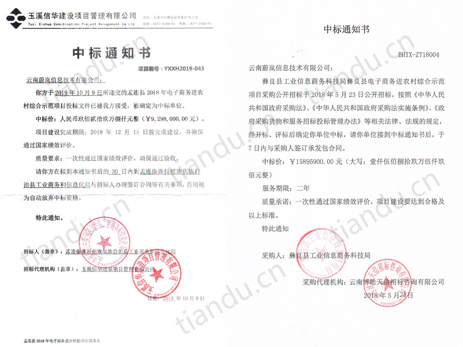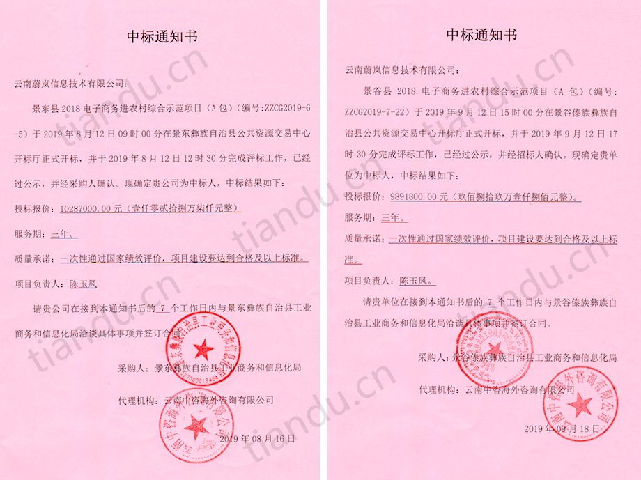 祝賀天度集團旗下“云南蔚嵐信息技術(shù)有限公司”中標景東縣、景谷縣、孟連縣等三個(gè)縣的電子商務(wù)進(jìn)農村綜合示范項目,目前云南蔚嵐信息技術(shù)有限公司已經(jīng)為昭通市彝良縣、大理州巍山縣、普洱市景東縣、普洱市景谷縣、普洱市孟連縣等5個(gè)縣提供了國家電子商務(wù)進(jìn)農村綜合示范縣項目的服務(wù)。