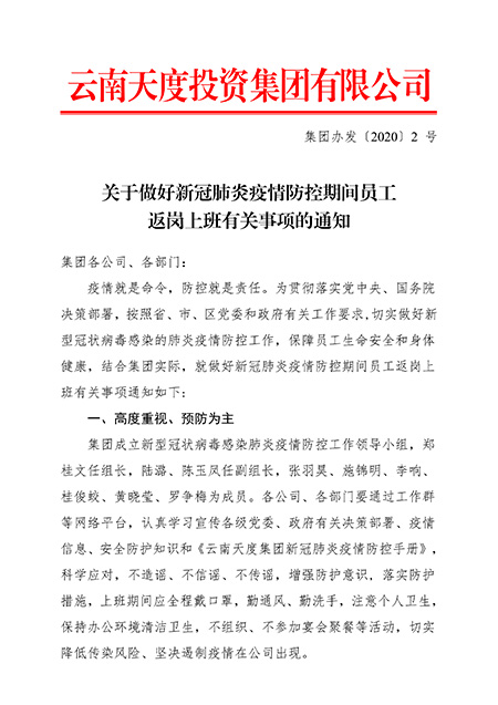 疫情就是命令,防控就是責任。為貫徹落實(shí)黨中央、國務(wù)院決策部署,按照省、市、區黨委和政府有關(guān)工作要求,切實(shí)做好新型冠狀病毒感染的肺炎疫情防控工作,保障員工生命安全和身體健康,集團成立新型冠狀病毒感染肺炎疫情防控工作領(lǐng)導小組,并就做好新冠肺炎疫情防控期間員工返崗上班有關(guān)事項作出通知:
