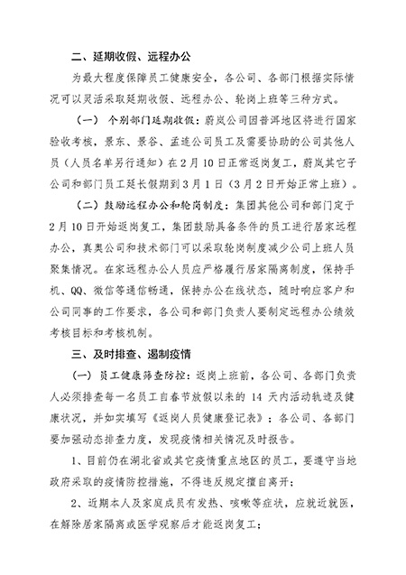 為最大程度保障員工健康安全,各公司、各部門(mén)根據實(shí)際情況可以靈活采取延期收假、遠程辦公、輪崗上班等三種方式。