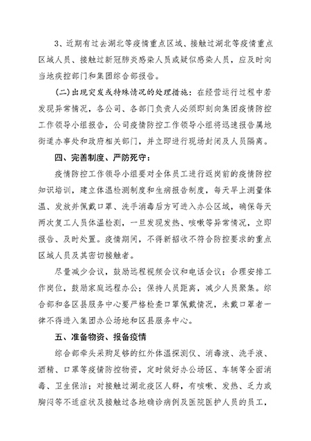 (二)出現突發(fā)或特殊情況的處理措施:在經(jīng)營(yíng)運行過(guò)程中若發(fā)現異常情況,各公司、各部門(mén)負責人必須即刻向集團疫情防控工作領(lǐng)導小組報告,公司疫情防控工作領(lǐng)導小組將迅速報告屬地街道辦事處和政府相關(guān)部門(mén),并立即進(jìn)行現場(chǎng)封閉及人員隔離。