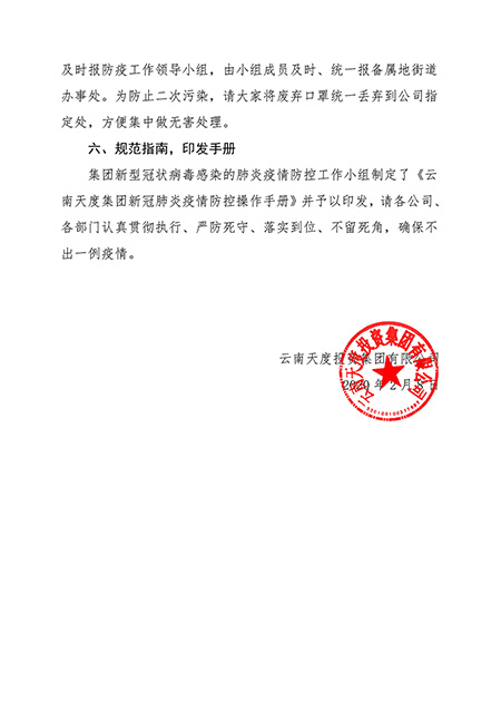 集團新型冠狀病毒感染的肺炎疫情防控工作小組制定了《云南天度集團新冠肺炎疫情防控操作手冊》并予以印發(fā),請各公司、各部門(mén)認真貫徹執行、嚴防死守、落實(shí)到位、不留死角,確保不出一例疫情。