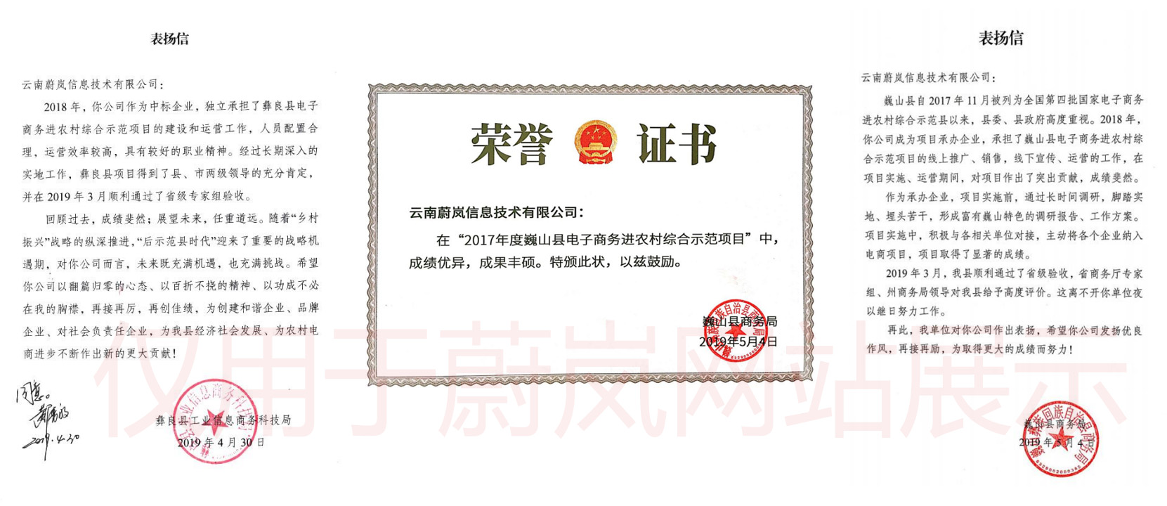 蔚嵐公司已中標并承擔了西雙版納州級統籌、彝良縣、巍山縣、景東縣、景谷縣、孟連縣、勐臘縣、魯甸縣、水富市、河口縣、峨山縣、盤(pán)州市等12個(gè)電子商務(wù)進(jìn)農村項目建設和運營(yíng)工作,中標臨滄市、文山市、水富市、蒙自市、個(gè)舊市、宣威市、 六盤(pán)水市 、麒麟區、馬龍區、陸良縣、永勝縣、 彝良縣、石屏縣、廣南縣、丘北縣等縣域商業(yè)建設行動(dòng)服務(wù)商,參與和承擔玉溪市、隆陽(yáng)區的中國好糧油行動(dòng)示范縣、示范企業(yè)項目建設。