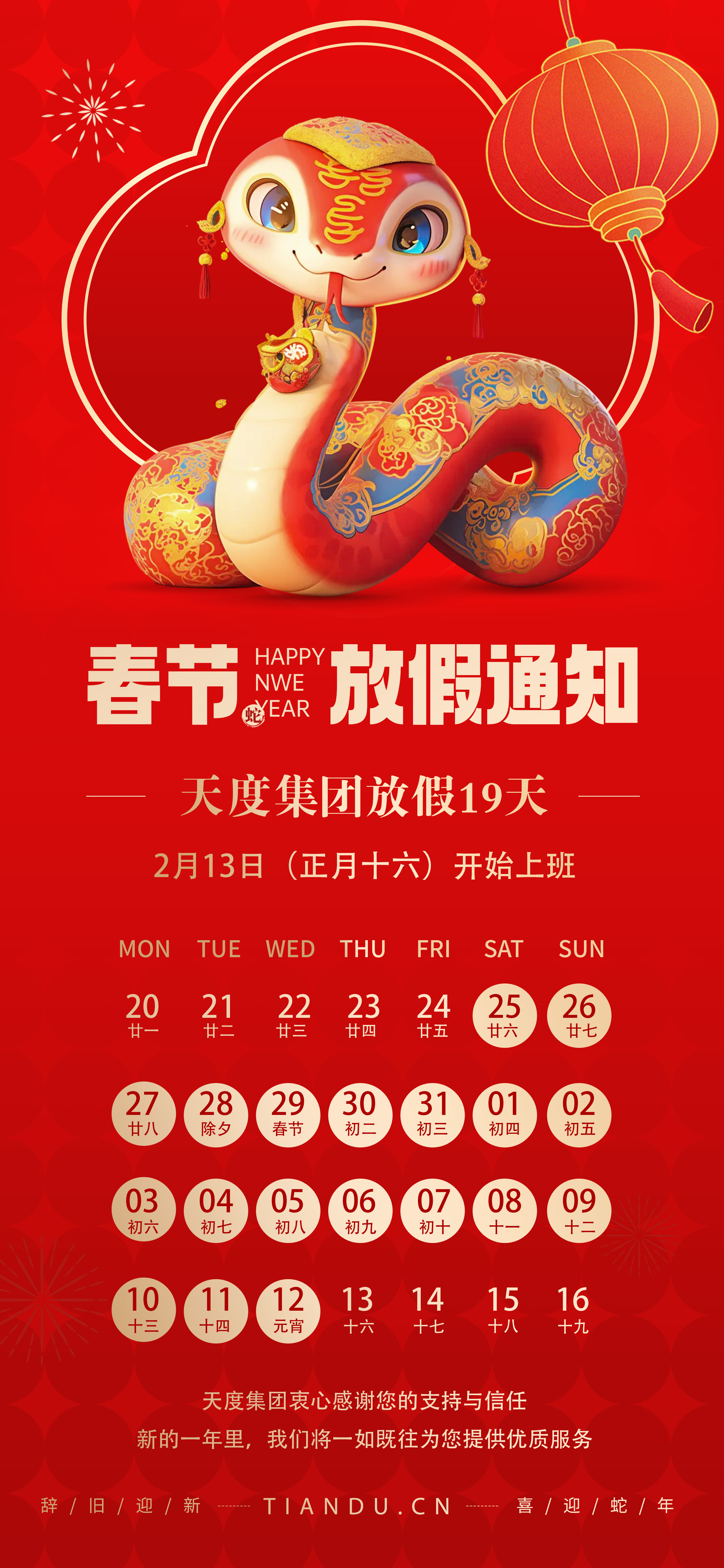 天度集團提前祝廣大客戶、合作伙伴及全體同事春節(jié)快樂,福氣滿滿,闔家幸福!