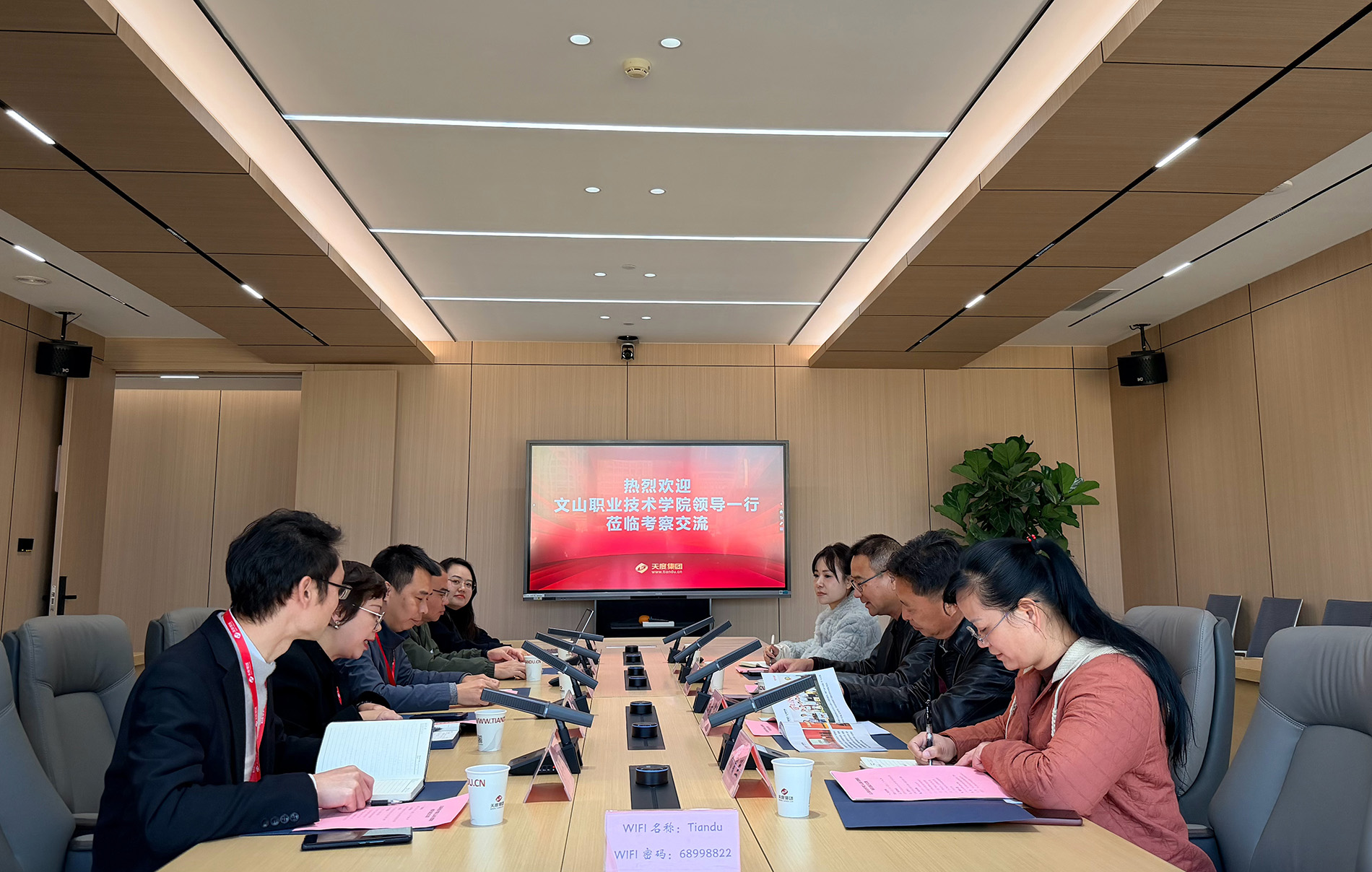 天度集團結(jié)合自身在智能制造、人工智能應用、數(shù)字化運營等領域的發(fā)展實踐,分析了相關行業(yè)對技術(shù)技能人才的能力要求,并介紹了集團在產(chǎn)教融合方面的現(xiàn)有模式與案例。儂援校長對天度集團二十年取得的成就表示贊賞,并介紹了文山職業(yè)技術(shù)學院在專業(yè)建設、人才培養(yǎng)方面的特色與規(guī)劃。他表示,此次參訪旨在深化學校與省內(nèi)優(yōu)質(zhì)企業(yè)的聯(lián)系,推動教育鏈、人才鏈與產(chǎn)業(yè)鏈、創(chuàng)新鏈的有機銜接。